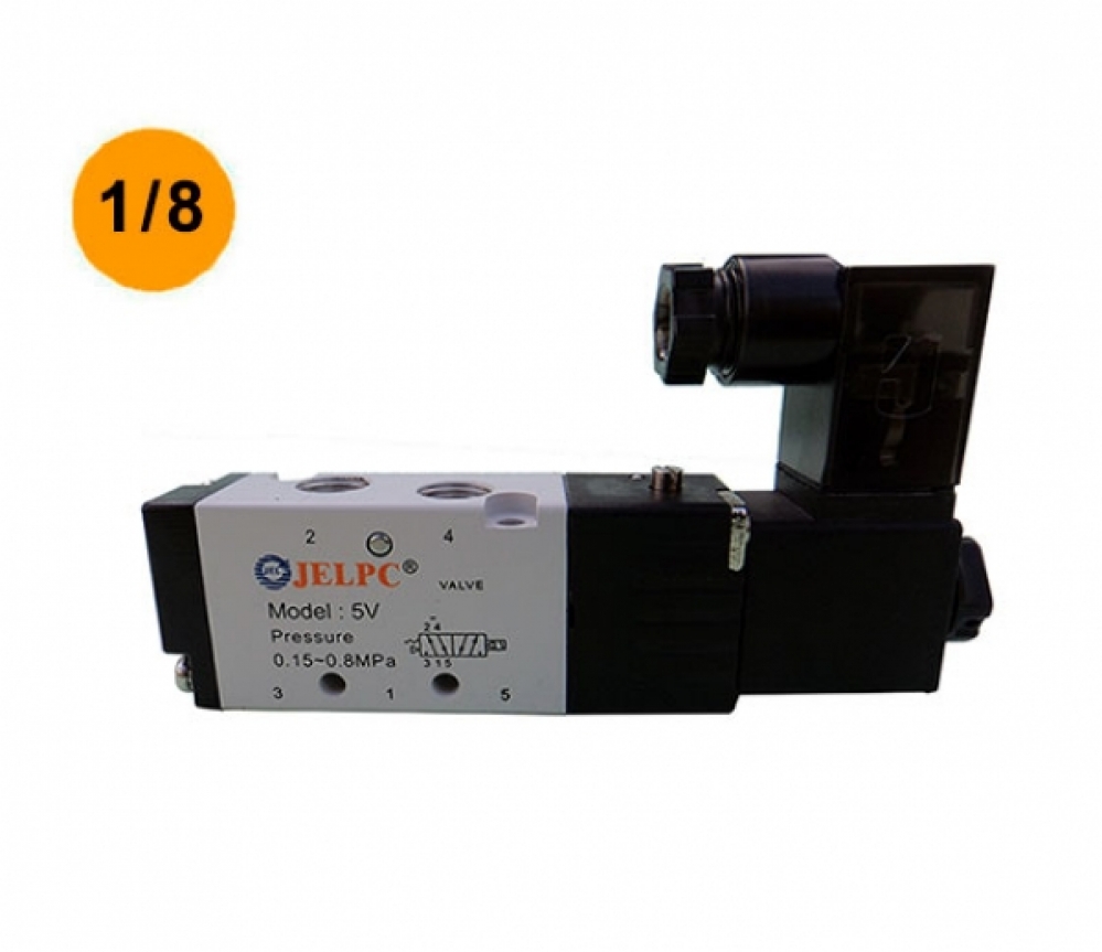 Válvula 5 vias 2 posições. Acionamento por solenóide e retorno por mola.
