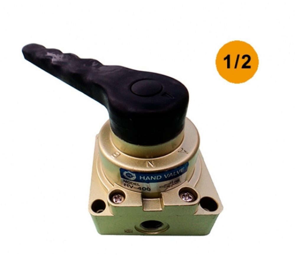 Válvula rotativa 4 vias 3 posições, centro fechado. Acionamento por alavanca e retorno trava.